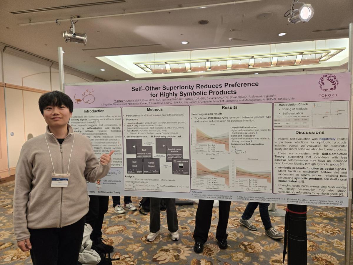 ニュース News 202603.09 自己評価は消費行動にどう影響するのか?(ポスター発表) Posted in 研究 象徴的製品(symbolic products)は、しばしば私たちの地位やアイデンティティを示すために用いられる。人々は、製品の機能的属性よりも象徴的価値に対してより多くの金額を支払う傾向があり、このような消費行動は自己概念によって動機づけられている。しかし、内的な自己評価が象徴的製品を購入したいという欲求にどのように影響するのかについては、依然として明らかではない。 本研究では、個人が自分自身に対して相対的に高い肯定的評価を持つ場合、象徴的製品を購入する意欲が低くなることが示された。さらに、自己評価を複数の次元に分けて検討した。その結果、この効果は道徳性(moral)の領域において有意であることが示された。すなわち、人々が自分自身を道徳的に高く評価する場合(例えば、自分を倫理的である、あるいは善良であると見なす場合)、高級品を購入したいという欲求は有意に低下した。 これらの結果は、「脳と心のメカニズム2026」においてポスター発表を行った(丁)。 添付ファイル 一覧へ戻る 前の記事 一覧へ戻る 次の記事 アーカイブ 月別 2026年03月2026年02月2026年01月2025年12月2025年11月2025年10月2025年09月2025年08月2025年07月2025年06月2025年05月2025年04月 年別 2026年2025年2024年2023年2022年2021年2020年2019年2018年2017年2016年