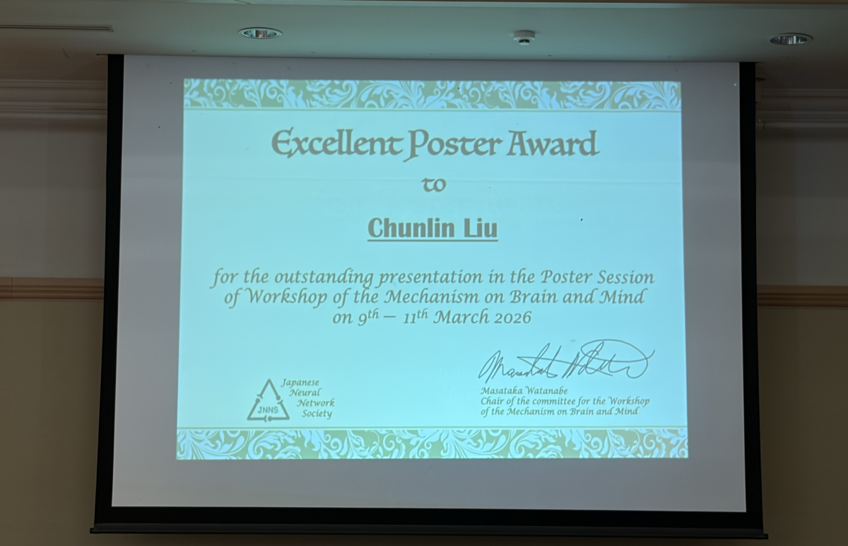 本研究は、2026年3月に開催された Mechanism of Brain and Mind (2026) においてポスター発表を行い、Excellent Poster Award を受賞いたしました。(Chunlin)
