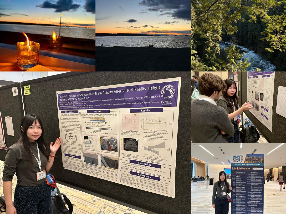 ニュース News 202603.09 VR高所トレーニングは自発的脳活動にどのような影響を与えるのか?(ポスター発表) Posted in 研究 本研究では、バーチャルリアリティ(VR)を用いた高所トレーニングが、健常者における恐怖反応および自発的脳活動に与える影響を検討しました。参加者は2週間にわたり複数回のVRトレーニングを実施し、その前後で安静時fMRIおよび行動指標を測定しました。その結果、VRトレーニング後に主観的恐怖評価の低下が認められ、楔前部(precuneus)を中心とした脳領域において内在的脳活動の変化が観察されました。 これらの結果は、反復的な安全曝露が健常者においても内在的脳活動の適応的変化を引き起こす可能性を示唆しています。学会では多くの研究者と議論する機会を得ることができ、有益な意見をいただきました。 本研究成果について、Cognitive Neuroscience Society (CNS) 2026 においてポスター発表を行いました。 学会はカナダ・バンクーバーで開催され、滞在中には English Bay や Stanley Park を訪れ、海と森林に囲まれた街の自然を体験することができました。 (管) 添付ファイル 一覧へ戻る 一覧へ戻る 次の記事 アーカイブ 月別 2026年03月2026年02月2026年01月2025年12月2025年11月2025年10月2025年09月2025年08月2025年07月2025年06月2025年05月2025年04月 年別 2026年2025年2024年2023年2022年2021年2020年2019年2018年2017年2016年