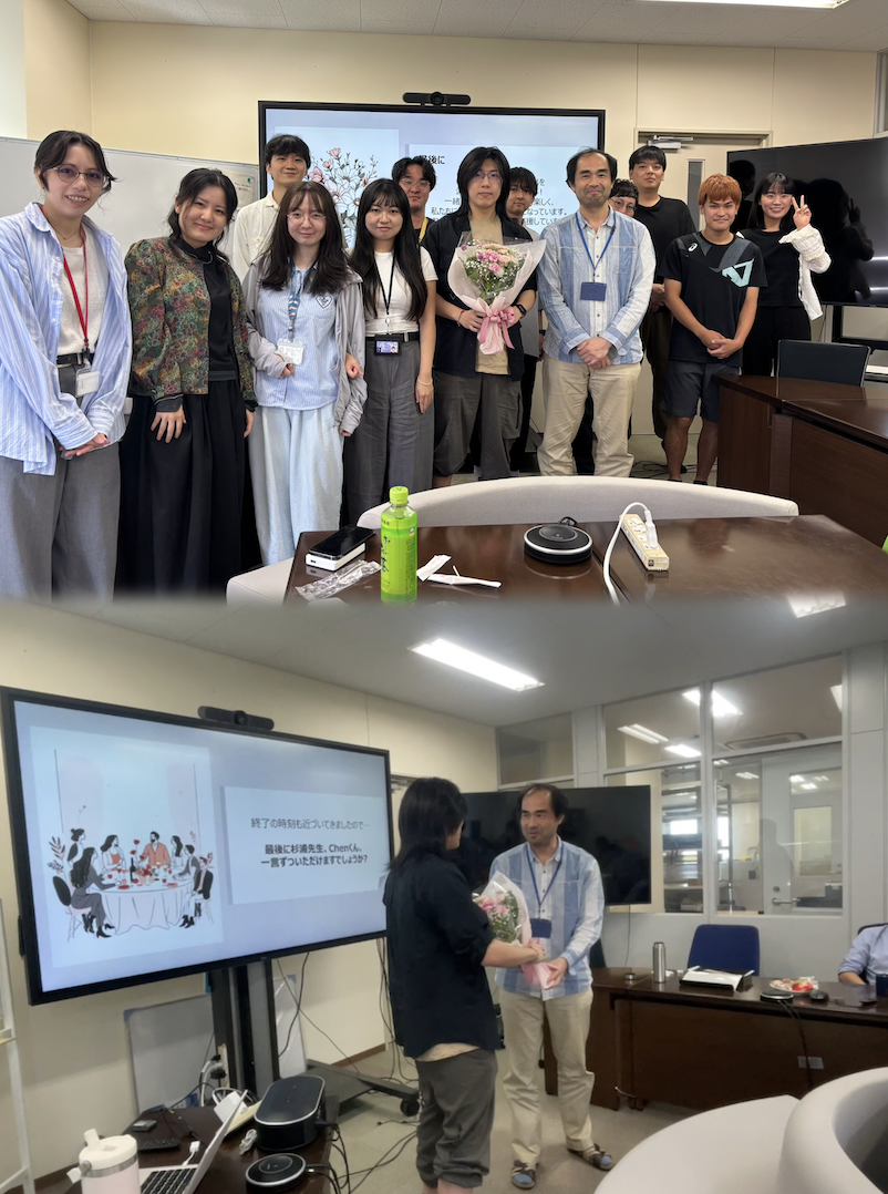 ニュース News 202509.22 送別会&学位取得の祝賀会 Posted in できごと 9月22日、研究室のダイニングルームで、9月に卒業される学生の皆さんのお祝いと送別会を行いました。 お弁当とお菓子を囲みながらこれまでの思い出や近況について話し合い、和やかで楽しい時間を過ごすことができました。 Chenくんには花束をお渡しし、感謝とお祝いの気持ちを皆で共有しました。 Chenくん、Jiaxinさん、Liuyuくん、修士・博士課程の間、本当にお疲れさまでした。 これからのお仕事や学び、そして日々の生活が順調で、充実したものとなるよう心より願っています。(鳥毛、宮津、暢) 添付ファイル 一覧へ戻る 一覧へ戻る 次の記事 アーカイブ 月別 2025年09月2025年08月2025年07月2025年06月2025年05月2025年04月2025年03月2025年02月2025年01月2024年12月2024年11月2024年10月 年別 2025年2024年2023年2022年2021年2020年2019年2018年2017年2016年