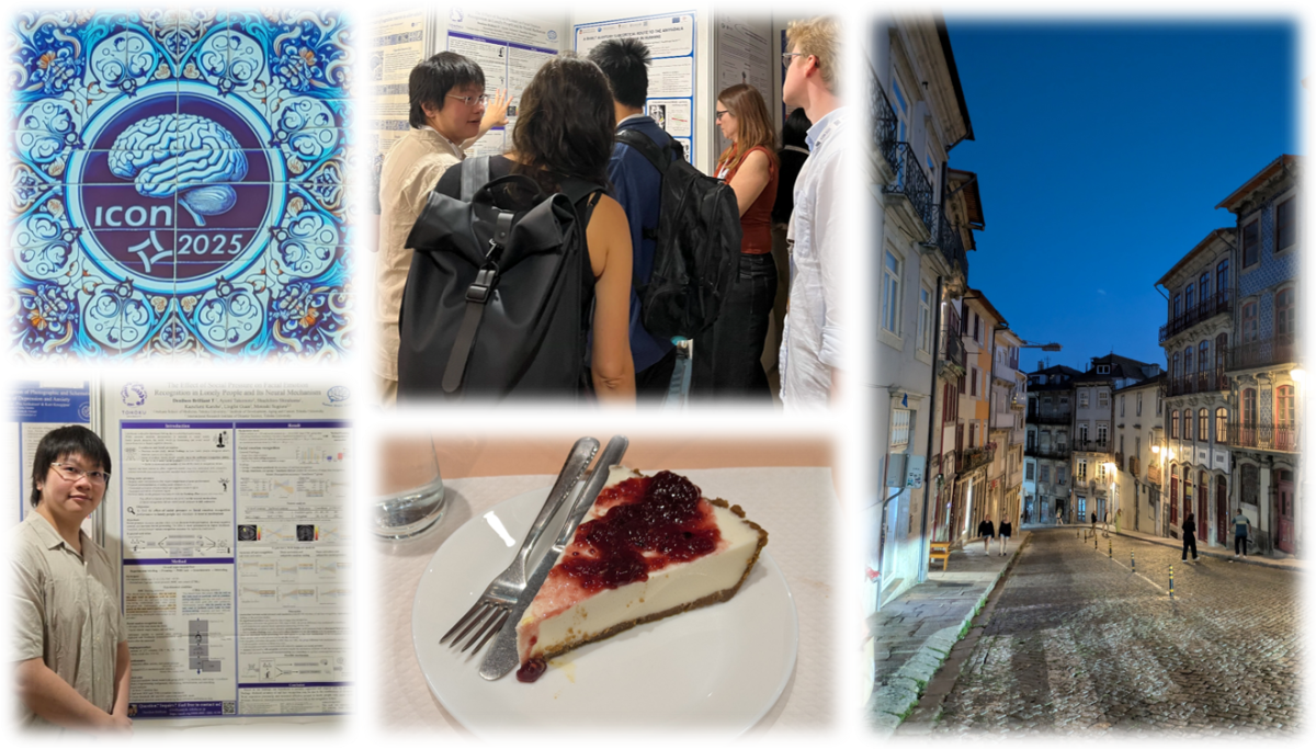 本研究では、悲しい表情の認識に関する先行研究の行動結果を再現し、認識の正確さは孤独感そのものではなく、孤独感と社会的プレッシャーの交互作用によって予測されることを確認しました。さらに、紡錘状回および扁桃体の活動に差が見られ、顔処理と脅威処理の組み合わせが、プレッシャー下における孤独感の高い人の悲しい顔認識失敗に関与している可能性が示されました。これらの成果を「孤独感の高い人における社会的プレッシャーが顔の感情認識に及ぼす影響とその神経メカニズム」というタイトルのポスターにまとめ、2025年9月15日〜20日にポルトガル・ポルトで開催されたInternational Conference on Cognitive Neuroscience – ICON2025(ICON2025)にて発表しました。